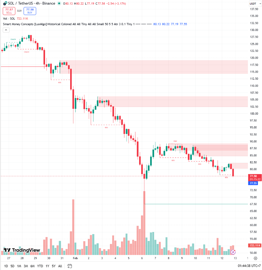 After attempting to recover to the $82.00 area, SOL was sharply rejected.