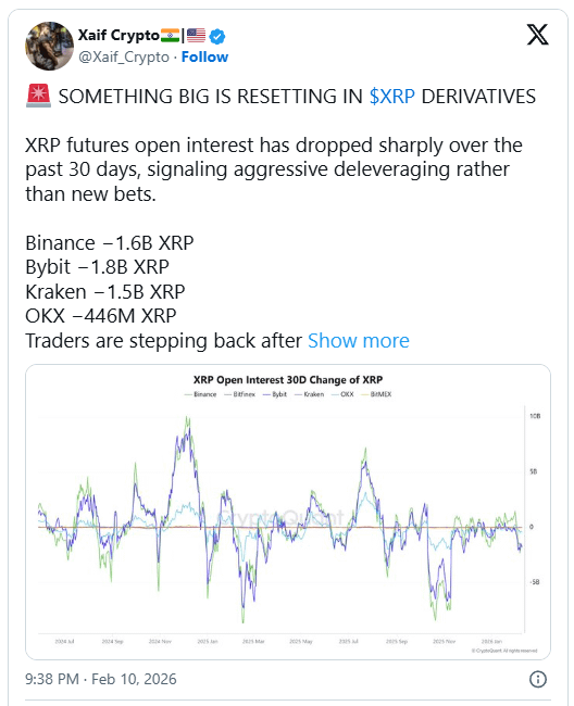 Data from major exchanges shows significant reductions, with Binance down 1.6 billion XRP, Bybit down 1.8 billion XRP, Kraken down 1.5 billion XRP, and OKX down 446 million XRP. This movement reflects widespread deleveraging as traders step back following recent volatility.