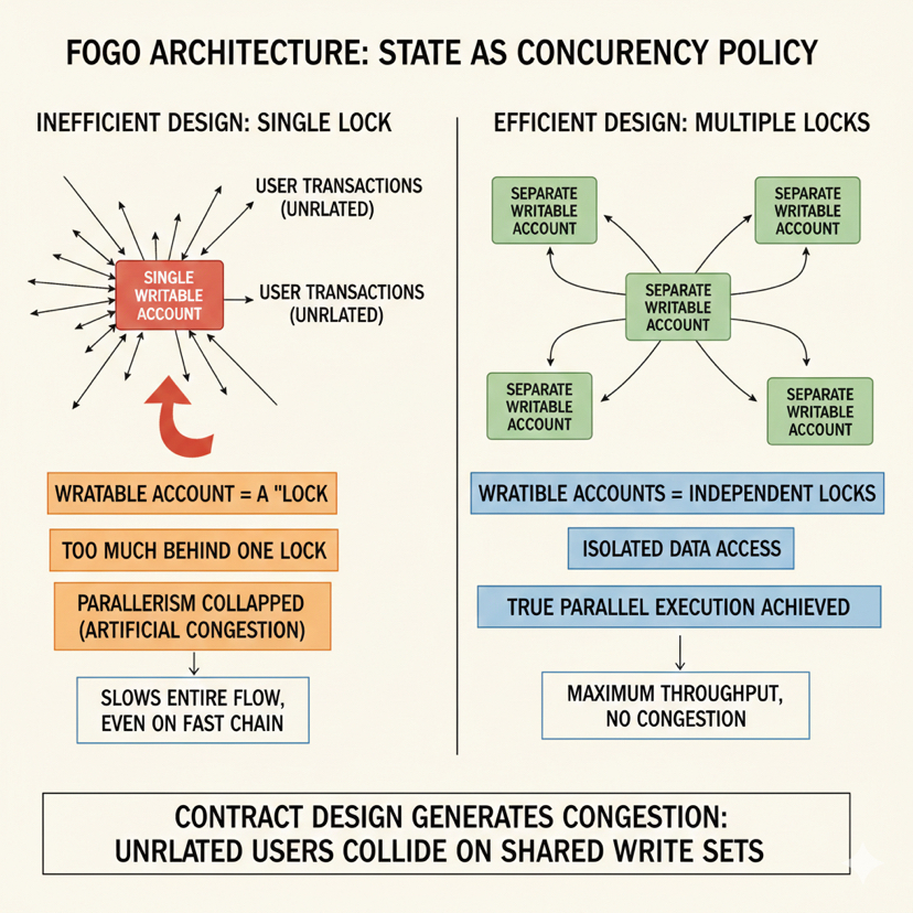 What changes on @Fogo Official is that state layout stops being just storage and starts being concurrency policy, because every writable account becomes a kind of lock, and when you put too much behind one lock you do not just slow a small component, you collapse parallelism for the entire flow, and the chain does not need to be congested for you to feel it, because your own contract design is generating the congestion by forcing unrelated users to collide on the same write set.