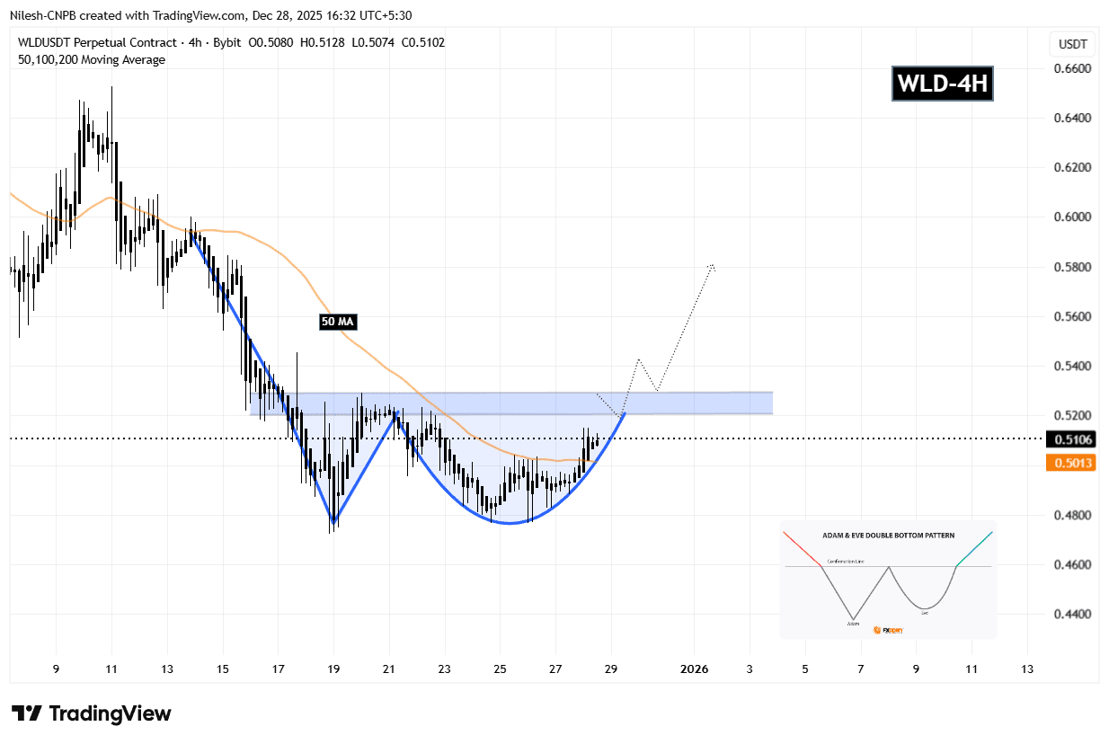 On the 4-hour chart, WLD is forming a textbook Adam and Eve double bottom pattern — a bullish reversal structure that frequently marks the end of downtrends.
