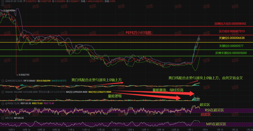 Today the market is expected to initially surge, testing 0.000006638, or even touching 0.000007513, but it will be difficult to hold. If it can't push higher, it will quickly retreat; first look for support near 0.0000057, and if it breaks, focus on the rebound position at 0.000005.