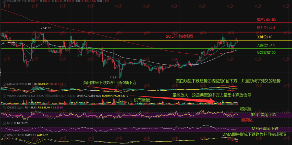 Brothers, SOL's movement today has been a bit frustrating. It looked strong this morning, but when I checked the 4-hour chart, something felt off. The MACD white line and yellow line are turning downward above the zero line, on the verge of a death cross! This is usually not a good sign—like running toward the summit, only to suddenly feel your legs give out and start sliding back down.