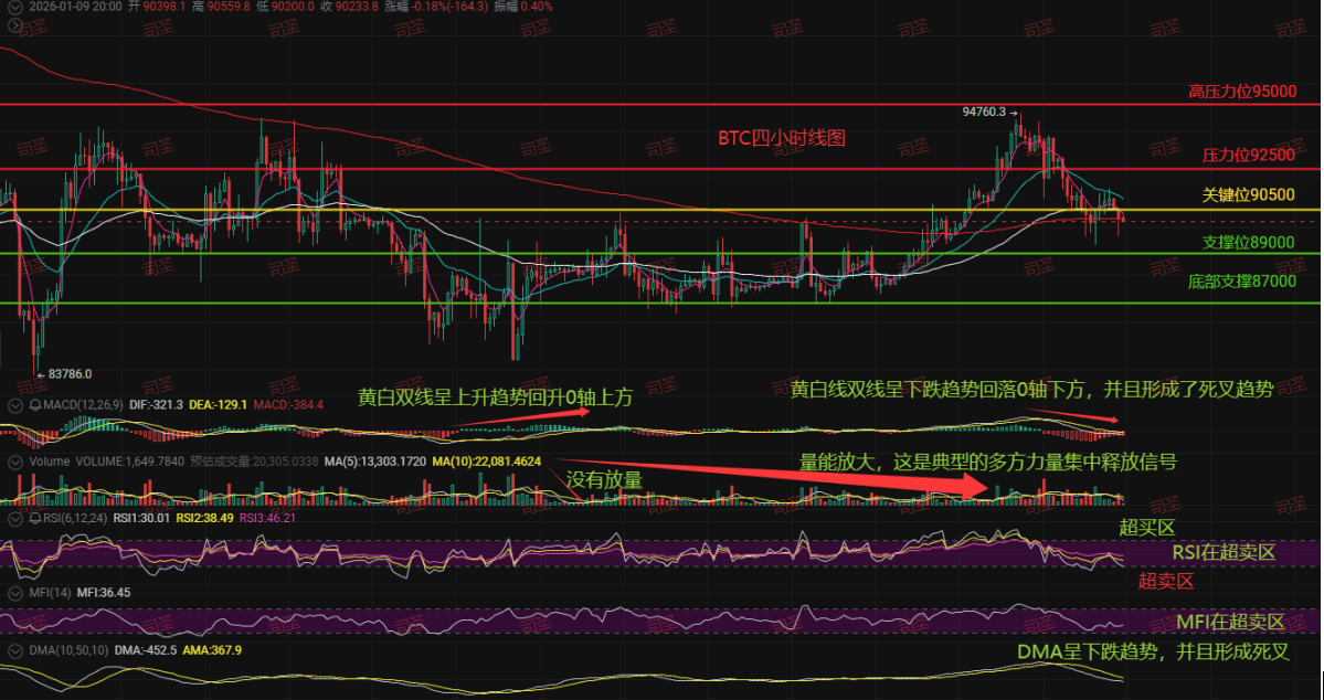 Even if there is news stimulation, the MACD death cross is here, and unless there’s a sudden surge, it’s hard to break through 92500 or even touch 95000. More likely, the movement will be: a rebound to around 90500-91000 and then it won't go up, continuing to look for support below, with 89000 as the first stop; if it can't hold, then look at 87000.