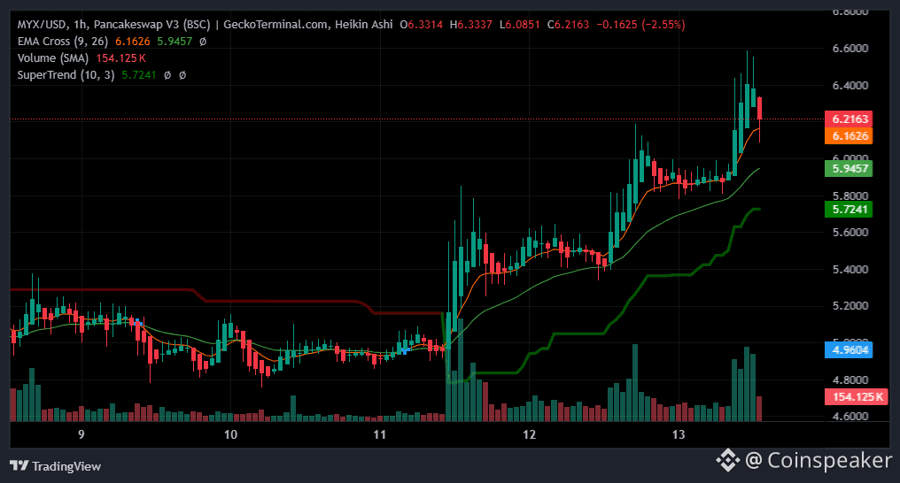 MYX Finance climbed 19% to hit $6.43 before pulling back to $6.15, where it traded at press time. The rally followed the token’s listing on KuCoin Alpha on Jan. 12.