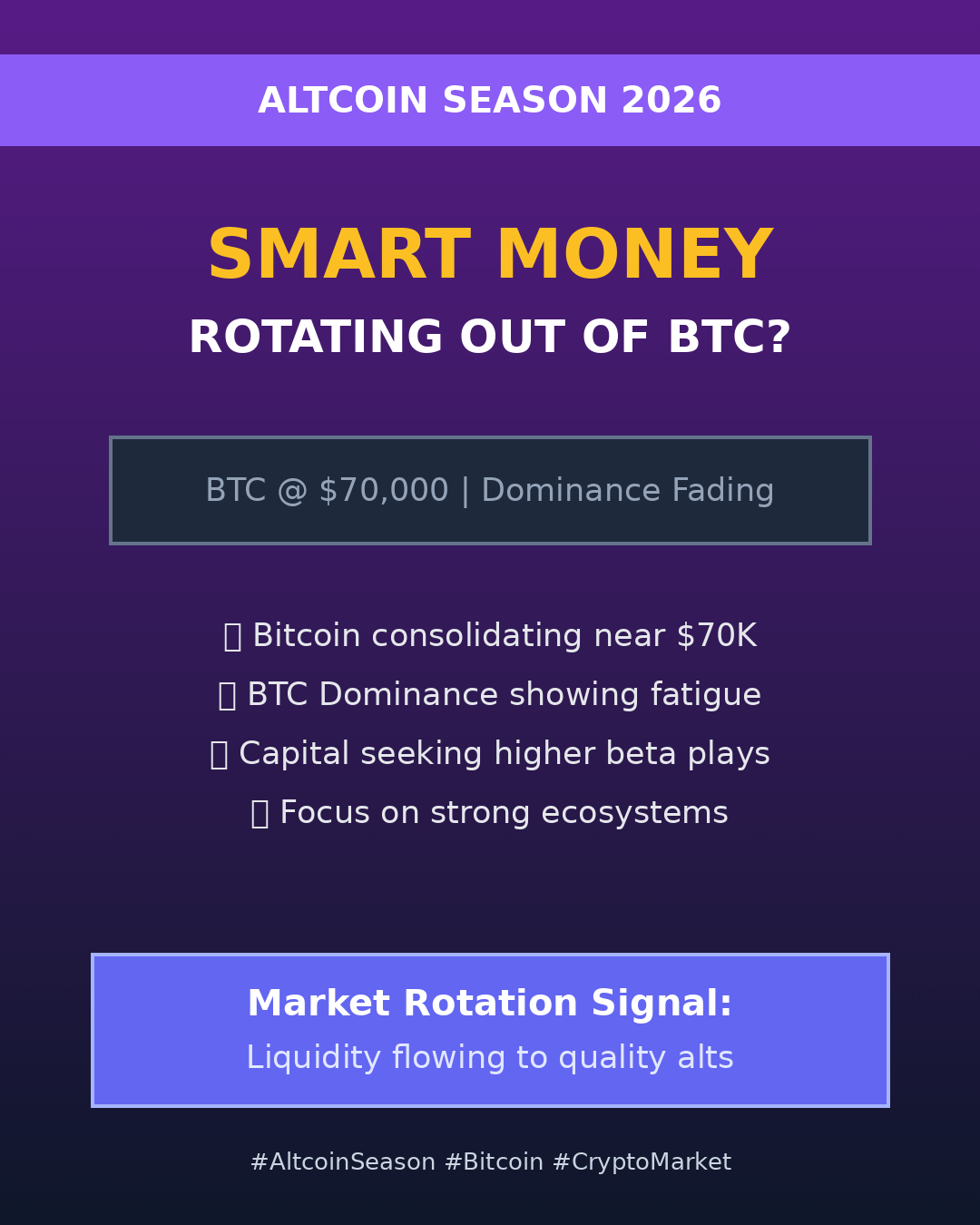 As Bitcoin consolidates near the $70,000 level in early 2026, market structure is quietly shifting beneath the surface. While BTC remains the anchor of the crypto market, its dominance (BTC.D) has begun to show signs of fatigue after an extended period of capital concentration. Historically, such phases—where Bitcoin stabilizes after a major trend while dominance rolls over—have often preceded meaningful altcoin rotations rather than broad market sell-offs. Smart money typically does not exit crypto entirely during these periods; instead, it reallocates risk toward assets with higher relative upside.
