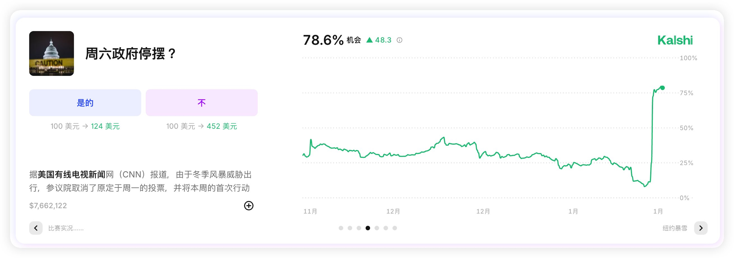 The probability of a current Kalshi shutdown has directly surged to 78.5%. However, this shutdown may not be as comprehensive as the one in October last year, as some functional departments have already received their annual budgets and will not enter a shutdown. Therefore, relatively speaking, even if a shutdown occurs, it should not be larger in scale compared to October.