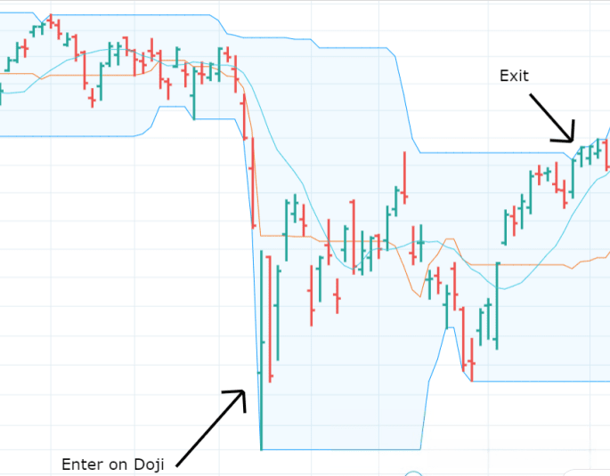 In the example below, you can see that after the price broke below the lower Bollinger Band, a doji candlestick pattern formed immediately.