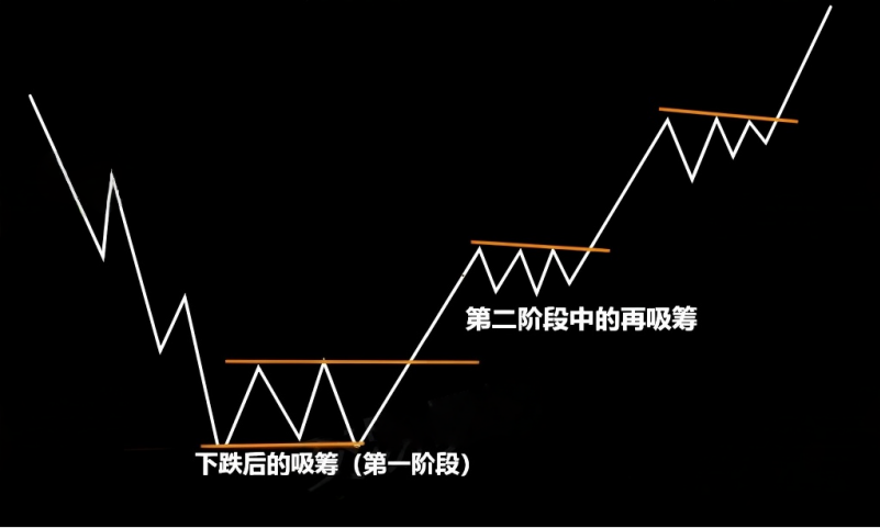 Phase One (Accumulation Phase): After a downtrend ends, prices begin to consolidate in a horizontal manner, followed by an upward breakout and continuation, eventually entering the second stage of an upward trend.