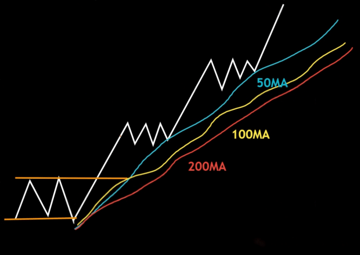 2. Prices need to undergo a period of horizontal consolidation above all key moving averages.
