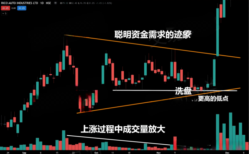 ❍ Continuous volume increase. Observe a series of trading days where both price and volume increase. This usually represents that institutions are accumulating positions and clearing weak holdings (trapping low-buying investors when a downward breakout fails). These 'washout days' help eliminate weak holders in the market.