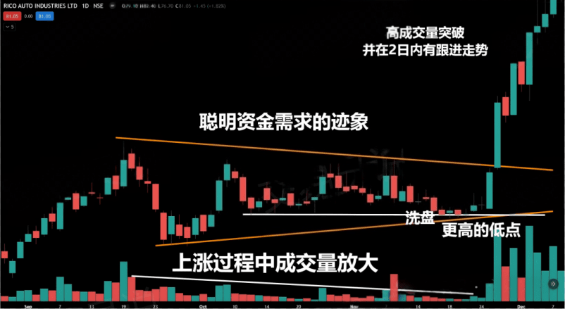 4. Before the breakout, signs of 'smart money' (institutional funds) activity should be observable in the pattern.