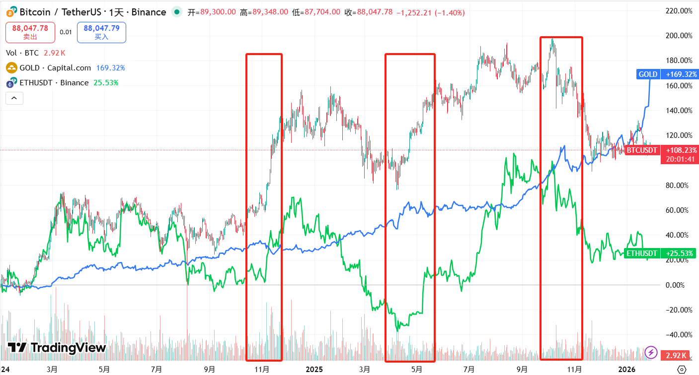 3. National and large capital purchases are the driving force behind the rise in gold prices. The logic leans more towards passive holding to hedge against macro risks. Only those aiming to make a profit (who find gold too expensive to buy) and die-hard fans in the crypto space (who aggressively promote digital gold) will buy Bitcoin. Bitcoin is merely a toy in the face of gold and real resources, only able to provide emotional premiums.