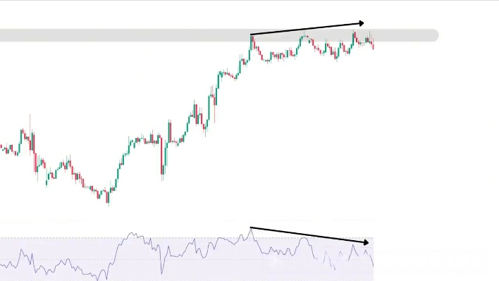 Look at this case: the price is in an uptrend (higher highs + higher lows), but after reaching a key price level, it forms weak three consecutive hits—each rise's magnitude is getting smaller, even nearly no increase, indicating that upward momentum is running out.