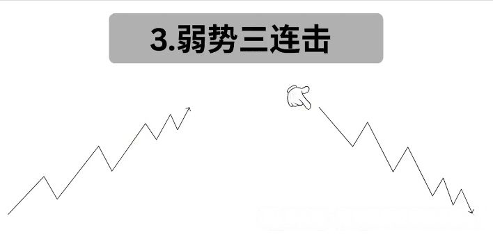 For example, in the previous weak three consecutive hits case, just having momentum decay is not enough; you must wait for the price to break below the previous low (uptrend destruction) to confirm the reversal. At this point, going short has low risk and high profit potential.