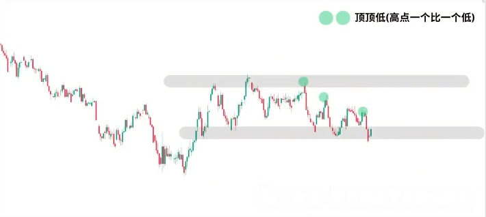 The price first declines, then enters a sideways consolidation, beginning to 'brew' near the support level—weakening rebound strength, forming a small structure of 'lower highs' (a typical sign of downward brewing).