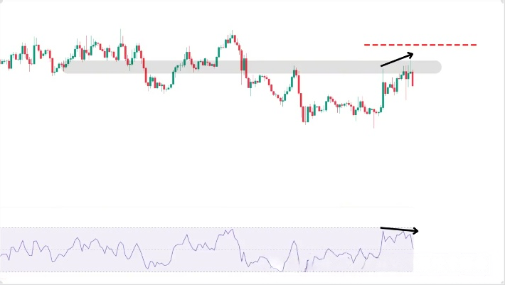 Multi-signal verification: then a large bearish candle appears (confirming downward momentum), while RSI forms a top divergence (the price makes a new high, but RSI does not, indicating a decrease in upward momentum);