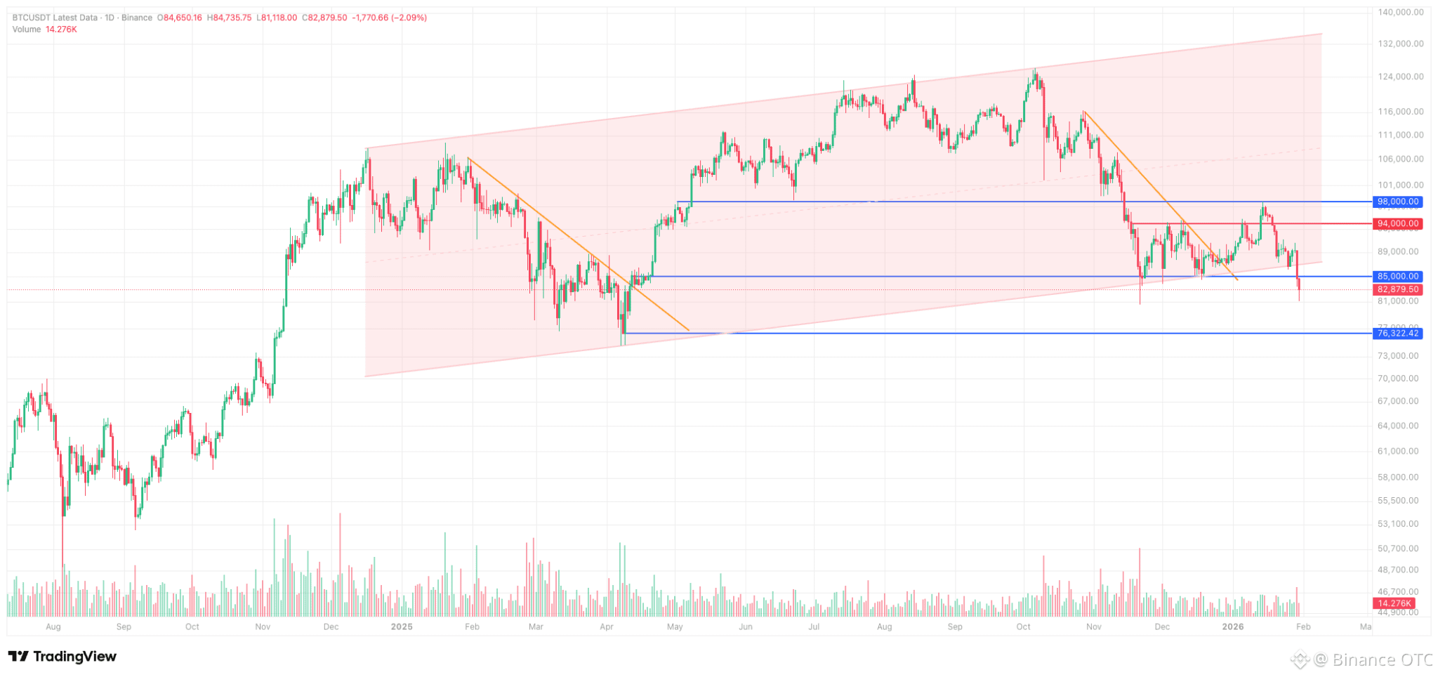 Bitcoin and the wider crypto market absorbed these headwinds acutely, breaking decisively through the $84,000 support level we've previously highlighted as critical. The inability to quickly reclaim this threshold has opened downside space toward the $80,000 support level and even the $74,600 low marked in April 2025.