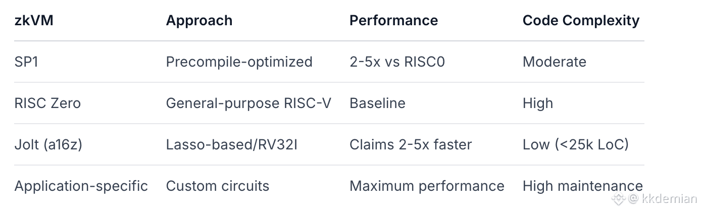 SP1 occupies a middle ground between general-purpose zkVMs (easier development) and application-specific circuits (maximum performance). The precompile system enables 5-10x cycle reduction for cryptographic operations common in blockchain workloads.