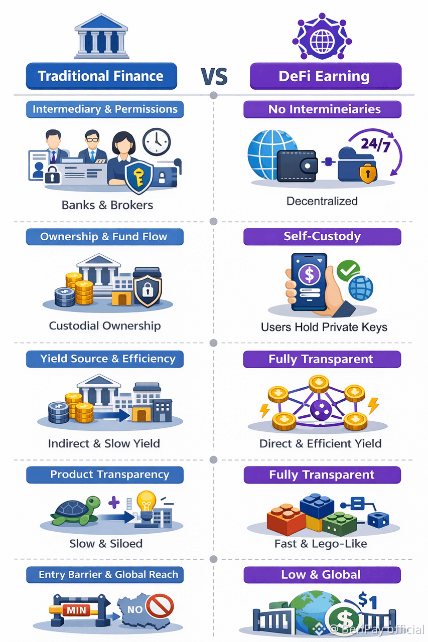 Compared to traditional finance (TradFi), DeFi earning requires no intermediaries, allows self-custody of funds, offers real-time interest accrual, and enables flexible strategy combinations.