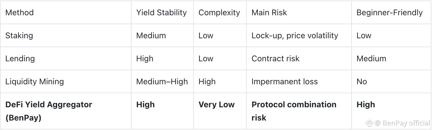 For beginners, using a DeFi yield aggregator (such as BenPay DeFi Earn) offers a friendlier, low-barrier entry into DeFi participation.