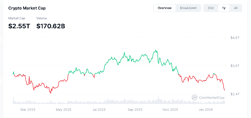 From an overall scale, the total market capitalization of the crypto market has fallen back to about 2.55 trillion USD, significantly reduced compared to early 2025 and close to the low point in April.