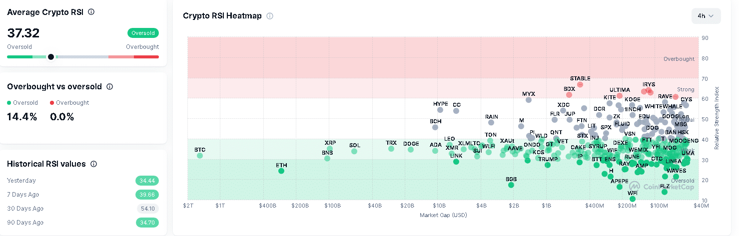 Bitcoin's RSI has dropped below 30, indicating a typical state of extreme overselling; Ethereum (ETH) has not been spared either. Currently, about 14.4% of crypto assets are in the oversold range, and market uncertainty remains very high, which is also a significant reason for the continued tension in investor sentiment.