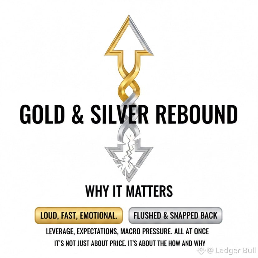 The recent GoldSilverRebound was not a calm technical bounce that only chart watchers noticed. It was loud, fast, and emotional, the kind of move that forces everyone in the market to reassess positioning. Gold and silver did not drift lower and politely recover. They dropped hard, flushed confidence, and then snapped back with authority. Moves like this rarely happen in quiet environments. They usually appear when leverage, expectations, and macro pressure collide at the same time.