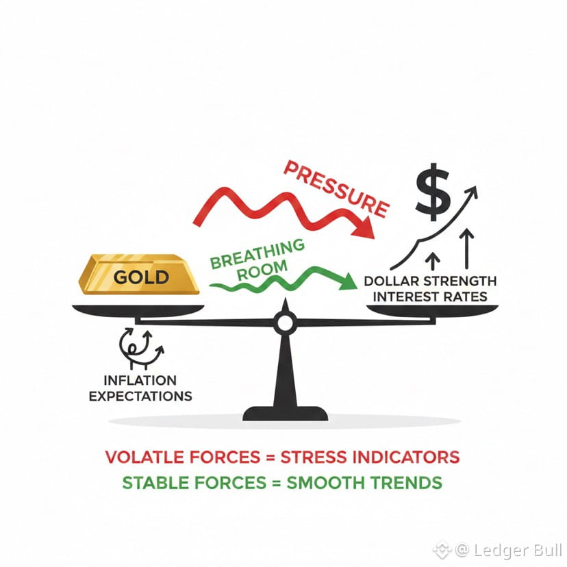 Gold does not move in isolation. The direction of the dollar and the path of rate expectations remain the biggest external forces. When the dollar strengthens aggressively, gold feels pressure. When yields rise faster than inflation expectations, gold struggles.