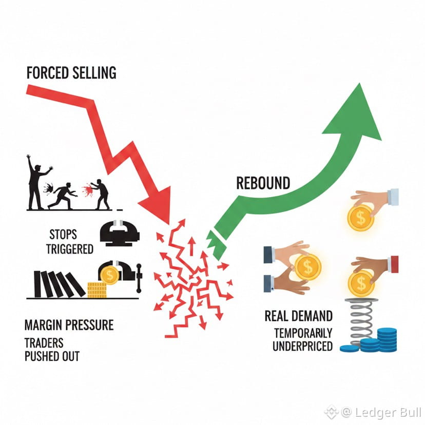 This drop had the signature of forced selling rather than thoughtful distribution. Stops were triggered. Margin pressure increased. Traders were pushed out rather than choosing to leave. That distinction is important because forced selling tends to end abruptly.