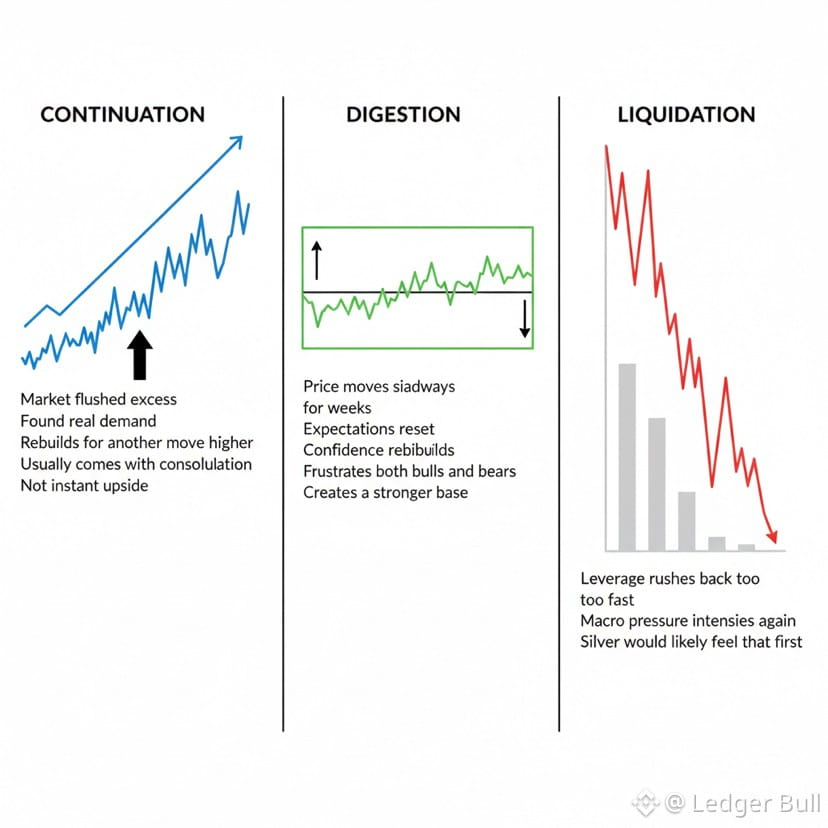 The final path is another liquidation. That happens if leverage rushes back too fast or if macro pressure intensifies again. Silver would likely feel that first.