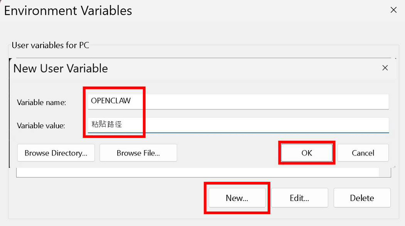 Then press Window + S to search and open Environment Variables, click New to manually add, and make sure to click OK at the bottom to complete the addition successfully.
