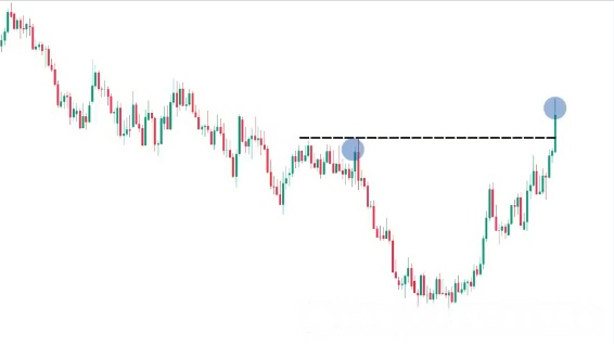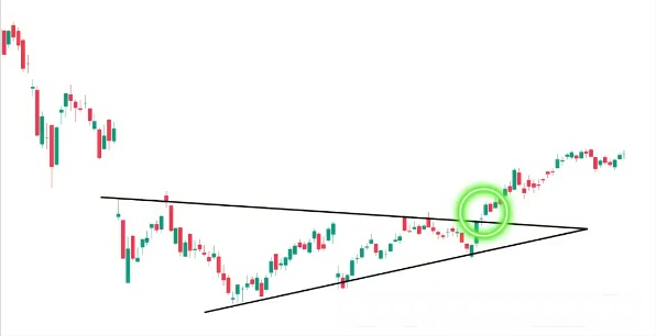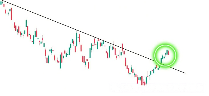Breaking through the downward trend line: Prices break upwards through the downward trend line, transforming trend support into resistance, ending the bear market;