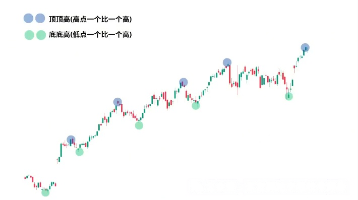 Trend structure: Higher highs + higher lows: This is the most core signal—prices are making higher highs (higher highs), and lows are also making higher lows (higher lows).