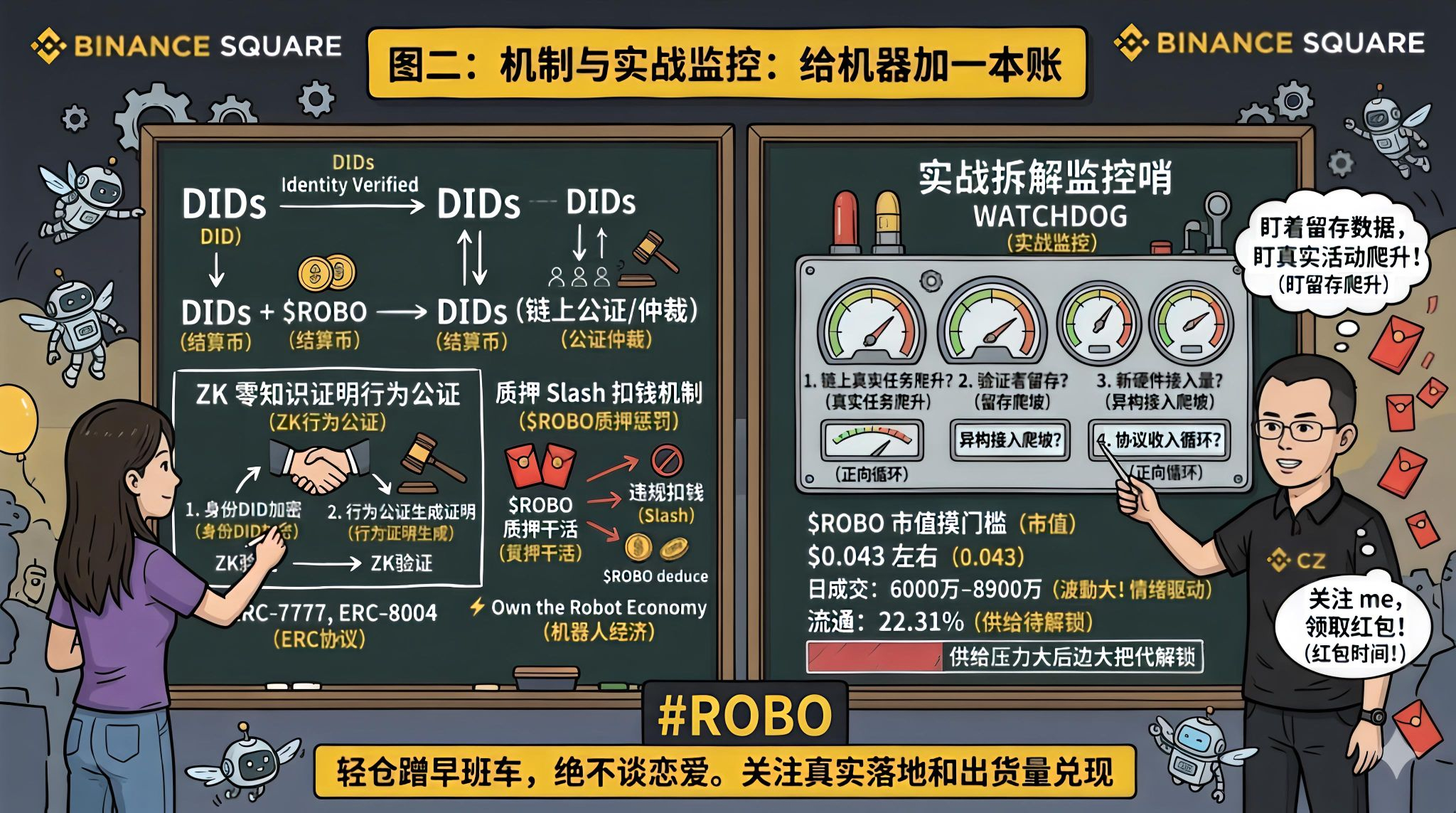 兄弟们,昨天有个老铁问我,说现在AI机器人这么火,有没有一个项目是真能让机器“干活赚钱”的,而不是炒个概念就完事了?我翻了翻最近的笔记,还真挖到一个让我眼前一亮的——@Fabric Foundation 和它的$ROBO 。说实话,以前见过太多“真实世界加密”的项目了。上来就吹机器人、AI、实体经济,叙事拉满,首日拉盘,大家嗷嗷冲进去。结果呢?三个月后,流动性跟挤牙膏似的,一天比一天少,K线慢慢放血。不是rug,不是跑路,就是单纯——故事没留住人。所以我这次看Fabric,最戳我的不是“机器人”三个字,而是他们问的那个问题:机器怎么才能不扯皮、不被赖账、不被假身份坑、不被一个中心节点卡脖子,稳稳当当地领到工资?这才是真问题。不是“机器人能不能飞”,而是“机器人能不能落地”。