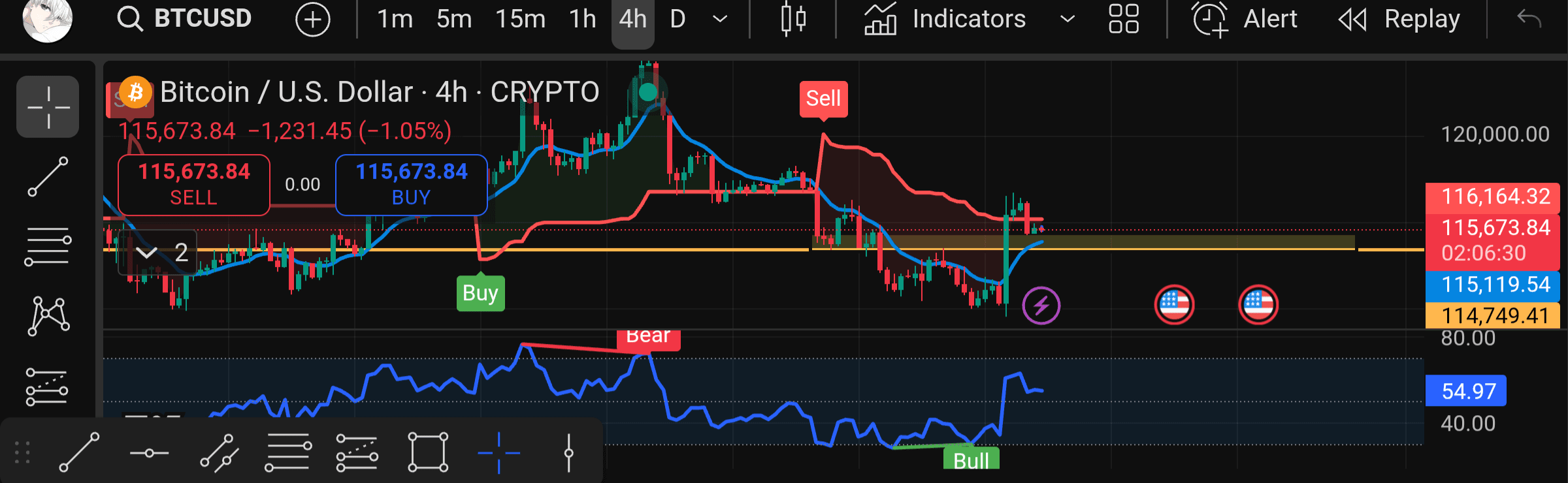 BTC ahora está comerciando alrededor de $115,673 en el marco de tiempo de 4 horas.