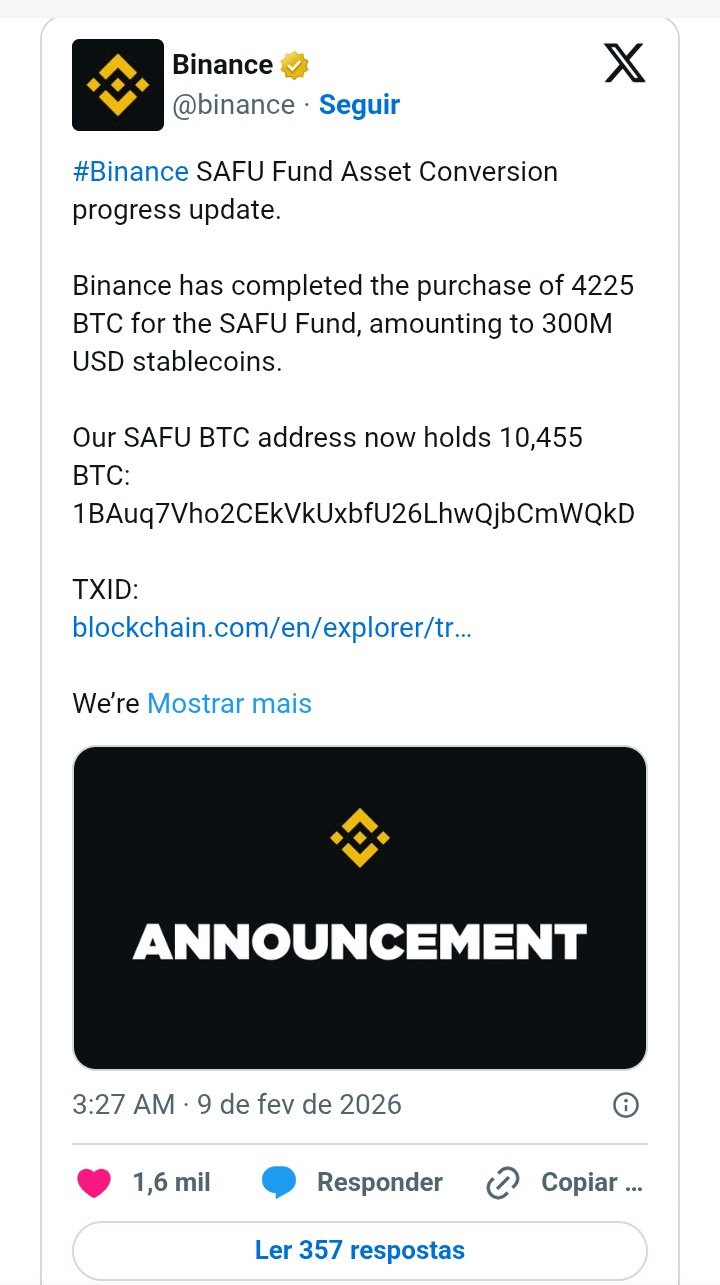 No começo do mês, a Binance já tinha falado que ia trocar pelo menos US$ 1 bilhão do SAFU, que era feito de stablecoin, por Bitcoin num prazo de 30 dias. Esse movimento faz parte de uma estratégia maior, ligada ao crescimento do mercado cripto e às cobranças cada vez mais fortes de governança, gestão de risco e responsabilidade.