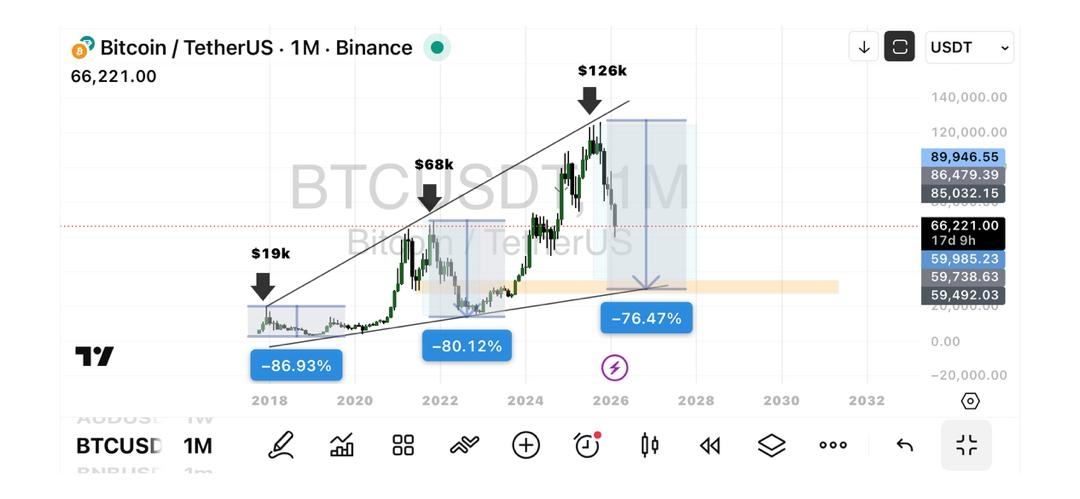 Si estudias el gráfico mensual de $BTC de cerca, notarás un patrón que sigue repitiéndose después de cada gran carrera alcista y nuevo máximo histórico, Bitcoin experimenta una corrección profunda