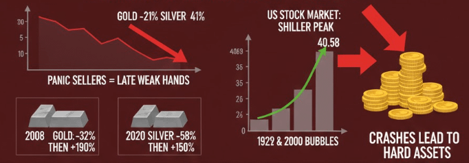 Las caídas de hoy — el oro cae un 21%, la plata un 41% — se sienten extremas.