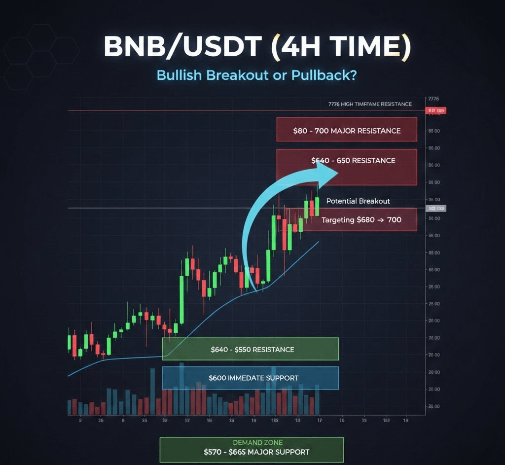 $BNB is currently trading around $624 after forming a strong base near the $570.06 swing low. The sharp rejection from that level signals aggressive buyer interest and potential accumulation. Price has started printing higher lows on the 4H chart, indicating short-term momentum recovery. However, overall structure remains sensitive as BNB is still trading below major breakdown zones from the $700+ region.