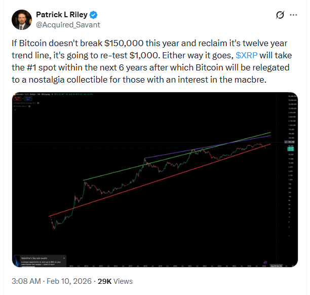Speaking further, Riley argued that whether Bitcoin reclaims the trendline at $600,000 or drops to $1,000, XRP could still take the top spot from it. He suggested that this could happen within six years, putting the deadline in 2032.
