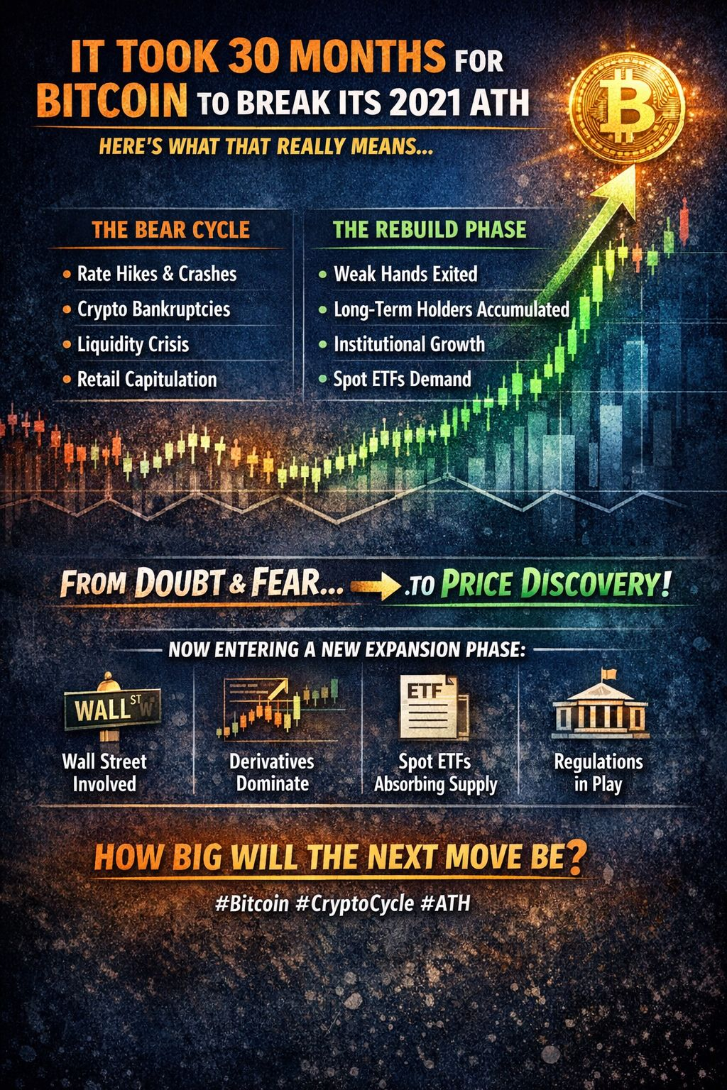 In previous cycles, Bitcoin has always needed time — not hype — to build a true breakout. The 30-month recovery wasn’t weakness. It was structural rebuilding: