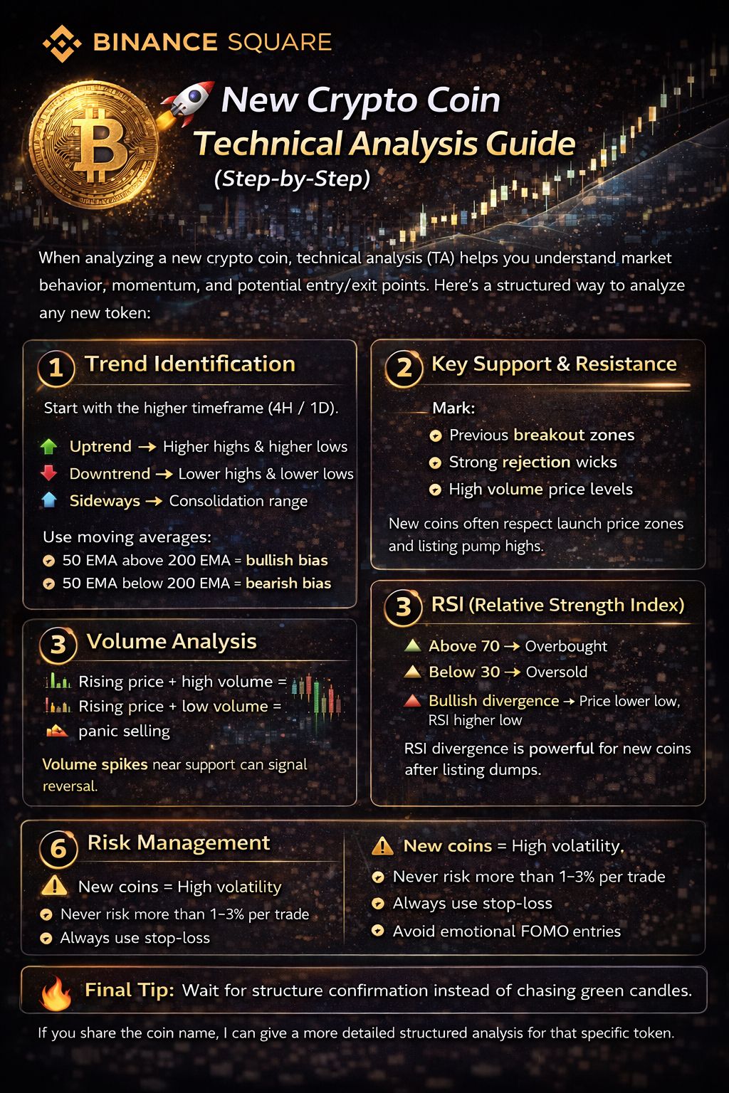 在分析一种新的加密货币时,技术分析 (TA) 可以帮助您了解市场行为、动能以及潜在的入场/出场点。以下是一种分析任何新代币的结构化方法: