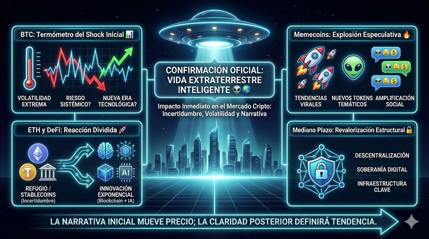 Imaginemos un escenario inédito: el gobierno de Estados Unidos anuncia oficialmente la existencia de vida extraterrestre inteligente 👽🌍. No hablamos de teorías, sino de confirmación formal. Un evento de esa magnitud no solo tendría impacto científico y cultural; provocaría una reacción inmediata en los mercados financieros, incluyendo el ecosistema cripto.