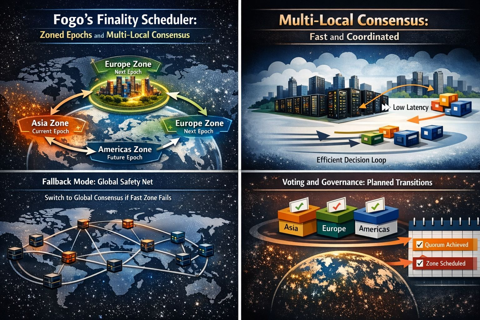 Reversión Global: Si los validadores no pueden ponerse de acuerdo sobre una zona, o si la finalización falla dentro de un tiempo de espera específico de la zona, el sistema automáticamente vuelve a un Modo de Consenso Global.
