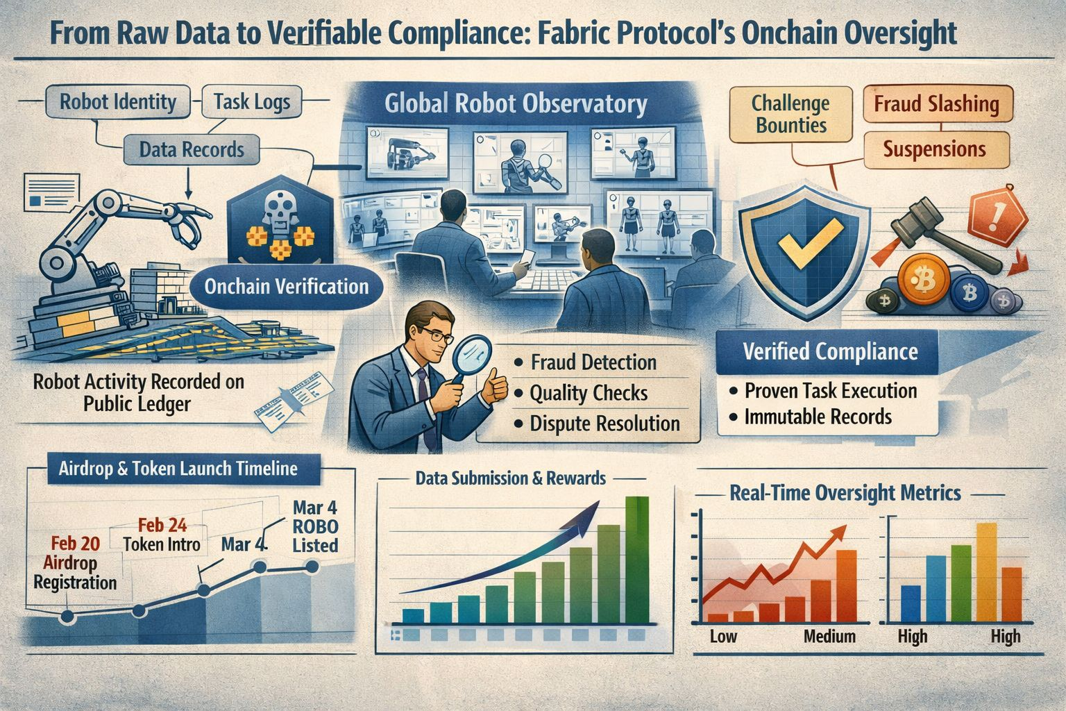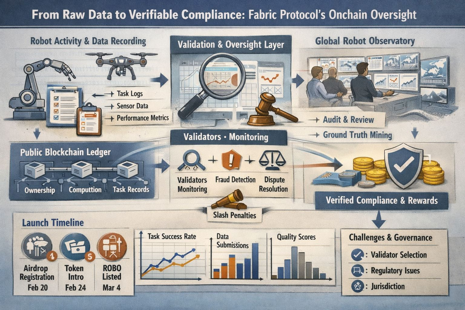 The sharper oversight mechanism sits in the verification layer. Fabric proposes validators who monitor quality and availability, investigate disputes, and earn challenge bounties when they prove fraud. The whitepaper also outlines slashing for proven fraud and suspensions when quality scores fall below a threshold. I find that more interesting than the token itself. A compliance system becomes believable when someone has authority, economic incentive, and a clear way to say, “This record is false.”