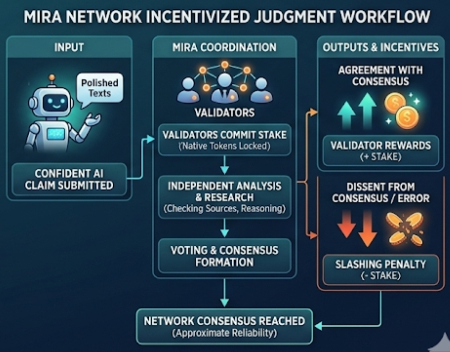 Mira Network sits somewhere inside that conversation. The system is built around a simple observation: verification takes effort, and effort usually requires incentives. Instead of assuming that people will fact-check AI outputs voluntarily, the network tries to turn that process into an economic activity.