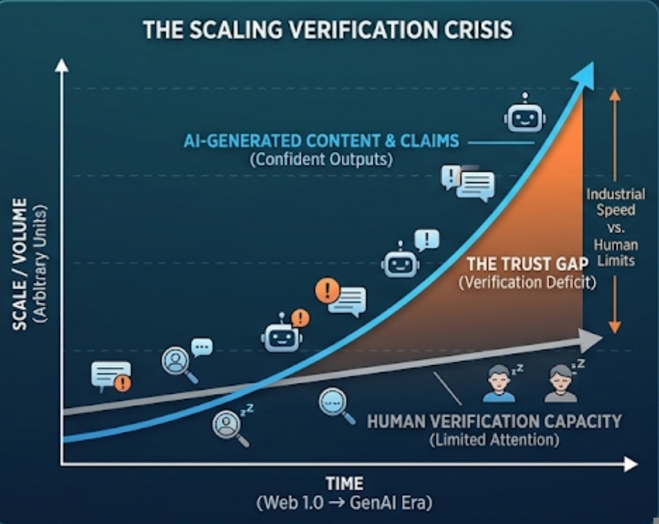 Human attention is limited. Careful reading takes time. When machines began generating text at industrial speed, the gap became obvious. Information exploded outward, while trust mechanisms remained slow and fragmented.