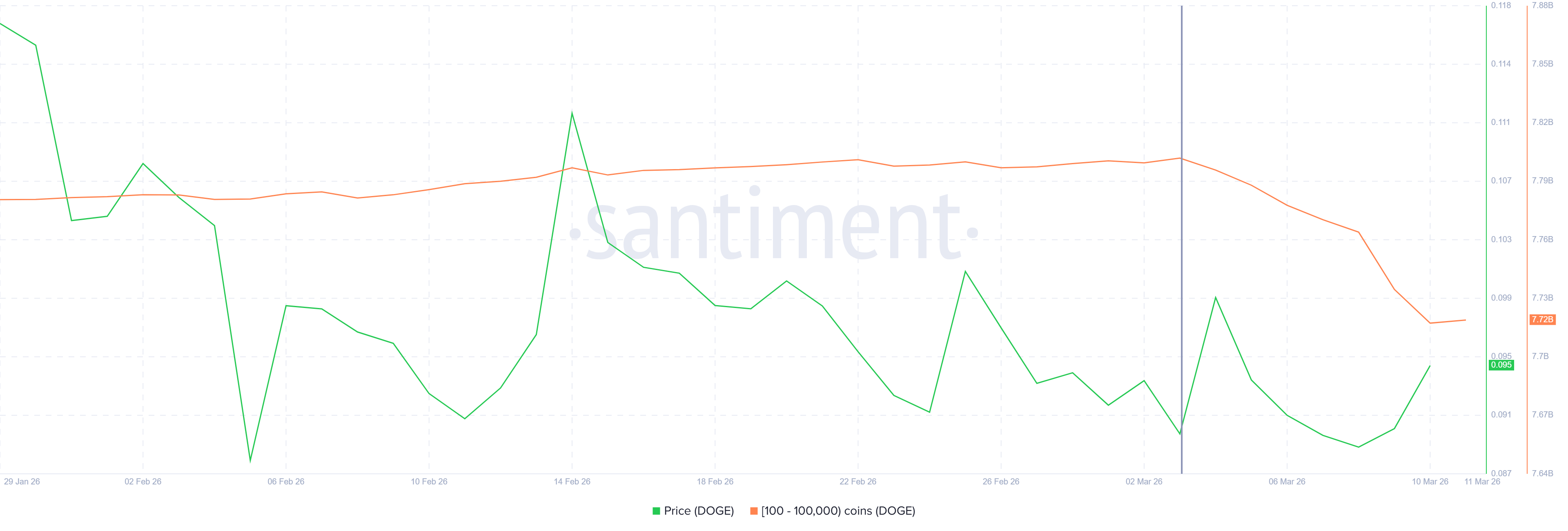 On-chain data shows wallets holding 100 to 100,000 DOGE sold over 80 million DOGE in the past week roughly $7.2 million worth.