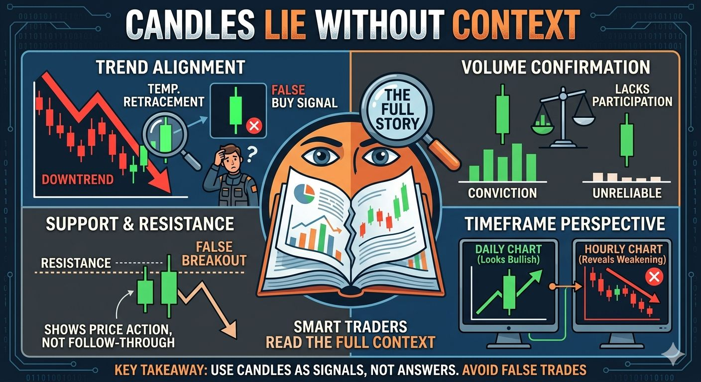 Price charts don’t lie but candlesticks alone can deceive if you ignore the bigger picture. A single red or green candle only tells part of the story. Traders who act purely on one candle risk jumping into false signals.