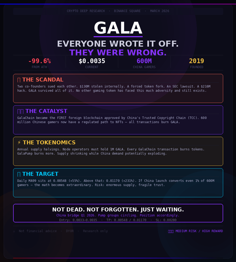 La mayoría de las personas miran el gráfico de GALA — abajo un 99.6% desde su máximo histórico — y siguen desplazándose. Esa es exactamente la reacción que crea oportunidades.